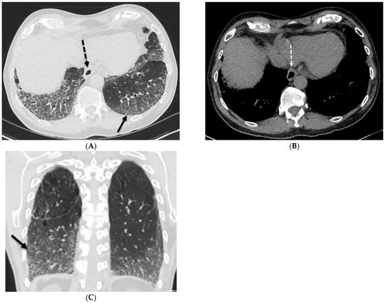 A 62-year-old male with a history of systemic sclerosis. Axial (A,B) and coronal (C) chest CT images demonstrate interstitial fibrotic process characterized by basilar predominant interlobular (solid black arrow) and intralobular septal thickening, traction bronchiectasis, and mild diffuse ground glass opacity without honeycombing. A dilated esophagus (dashed arrow) was also observed consistent with esophageal dysmotility, a common feature of scleroderma.