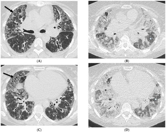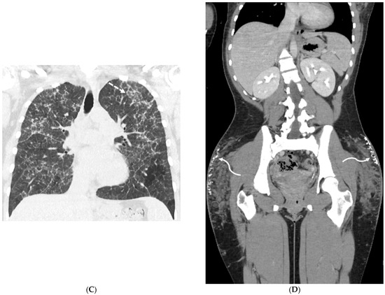 The incidence of PVS after catheter ablation of the left atrium for atrial fibrillation ranges from 1% to 3%. Histopathologically, PVS manifests as a fibromuscular proliferation with occlusion of pulmonary veins. The pulmonary parenchyma is congested with interlobular and alveolar septal thickening, arteriopathic changes, and hemosiderosis [27]. CT in patients with PVS reveals bilateral scattered GGOs, diffuse ILST, and patchy consolidation (Figure 11).