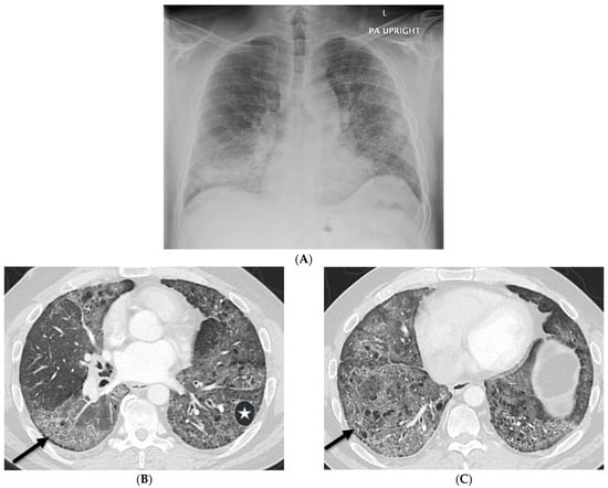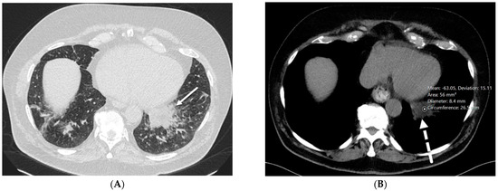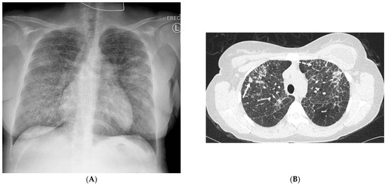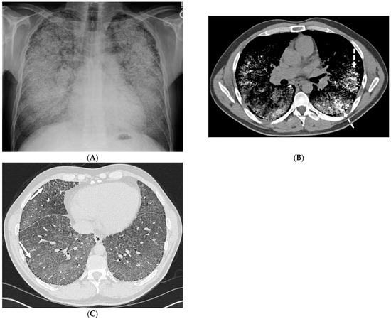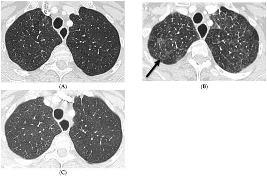 ILST is a common finding in viral pneumonia, particularly for cytomegalovirus, influenza A virus, rhinovirus, herpes simplex virus, varicella zoster virus, and human bocavirus pneumonia. Adenovirus pneumonia shows multifocal GGOs with patchy consolidations bilaterally and may show lobar or segmental distribution. In herpes simplex virus pneumonia, predominantly multifocal segmental or subsegmental areas of GGOs and less dominant focal areas of consolidation are noted on CT. In varicella zoster virus infection, CT usually shows 1–10 mm nodules with a surrounding halo of GGOs, patchy GGOs, and coalescence of nodules diffusely throughout both lungs. Bilateral asymmetric GGOs, small centrilobular nodules, and airspace consolidation are the predominant CT findings with cytomegalovirus infection. Mediastinal lymphadenopathy, interstitial infiltrates, and widespread GGOs can be seen with Epstein–Barr virus infection [9] (Figure 2).