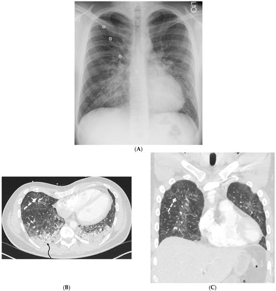 A 25-year-old male with no significant past medical history admitted with acute hypoxic respiratory failure with cough, nausea, and vomiting after vaping one month ago. A frontal chest radiograph (A) and axial and coronal chest CT images (B,C) show diffuse ground glass opacities in the lungs and dependent consolidation (curved black arrow) in bilateral lower lobes. Smooth interlobular septal thickening (dashed white arrow), predominantly in lower lobes, is also visualized on CT images.