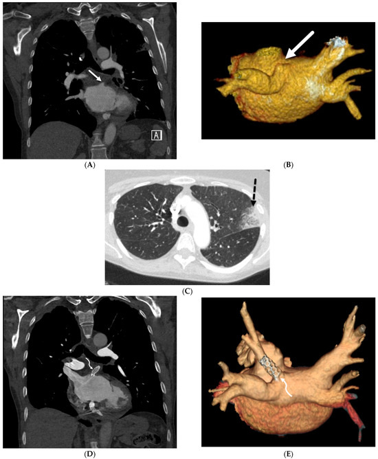 A 73-year-old female with atrial fibrillation refractory to medication post catheter ablation. Coronal chest CT and posterior view volume-rendered images of left atrium and pulmonary veins (A,B) demonstrate abrupt cut off of the left superior pulmonary vein (solid white arrow). An axial chest CT image (C) shows focal ground glass opacity and interlobular septal thickening (dashed black arrow) in the upper left lobe, representing pulmonary venous congestion and developing pulmonary venous infarct. Subsequent coronal chest CT (D) and posterior view volume-rendered images of the left atrium and pulmonary veins after stent placement (E) demonstrate the patency of the left superior pulmonary vein (curved white arrow).