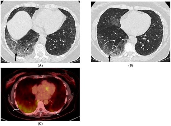 - Akira, M.; Ishikawa, H.; Yamamoto, S. Drug-induced pneumonitis: Thin-section CT findings in 60 patients. Radiology 2002, 224, 852–860. [Google Scholar] [CrossRef] [PubMed]