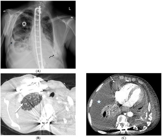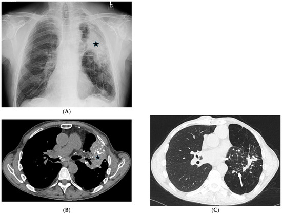 A 65-year-old male with a history of silicosis, coal worker’s pneumoconiosis, and pulmonary hypertension post right lung transplantation. A frontal chest radiograph (A) and axial chest CT images (B,C) demonstrate a partially calcified mass-like consolidative opacity in the left upper lobe (star) representing progressive massive fibrosis. Interlobular septal thickening (solid white arrow) is also noted in the left lower lobe on CT images.