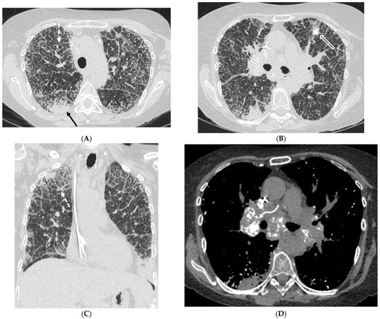 LIP is a rare form of ILD usually associated with other systemic diseases such as primary Sjögren’s syndrome, rheumatoid arthritis, systemic lupus erythematosus, mixed connective tissue disease, HIV infection, and some medications such as amiodarone. CT findings of LIP include GGOs, air cysts, ILST, thickening of the peribronchovascular interstitium, and poorly defined centrilobular or subpleural nodules (Figure 6). ILST and intralobular reticular opacities correspond to lymphocytic infiltration and mild fibrosis of interlobular or intralobular septa [17].