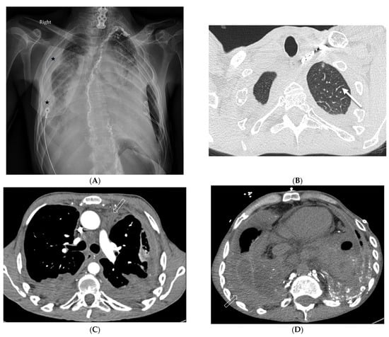 A 52-year-old female with advanced HIV infection and Kaposi’s sarcoma of the skin, lung, and gastrointestinal tract. A frontal chest radiograph (A) shows widespread nodules, consolidation, and bilateral pleural effusions. Axial chest CT images (B,C) demonstrate scattered ill-defined solid nodules (dashed white arrow), smooth interlobular septal thickening (open white arrows), and pleural effusions (stars).