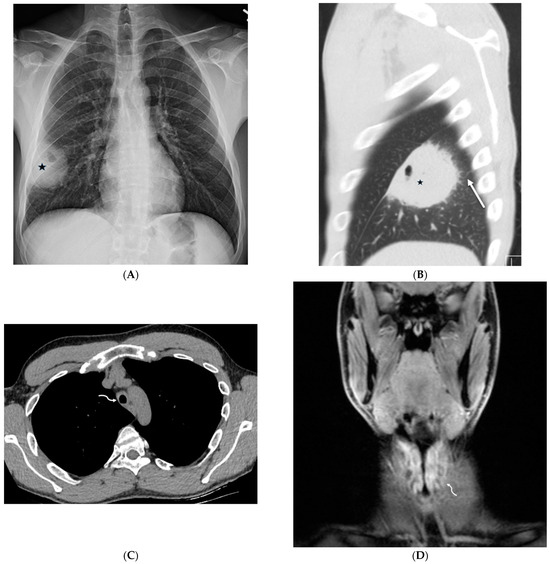 - Nobre, L.F.; Müller, N.L.; de Souza Júnior, A.S.; Marchiori, E.; Souza, I.V. Congenital pulmonary lymphangiectasia: CT and pathologic findings. J. Thorac. Imaging 2004, 19, 56–59. [Google Scholar] [CrossRef] [PubMed]