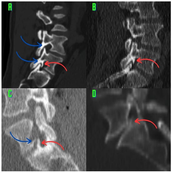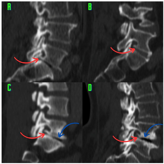 In the L5 (L5–S1) foramina, osteophytes arising from the pedicle–lamina junction and osteophytes arising from the superior endplate of the lower vertebrae are observed. (A) An osteophyte (red arrow) is observed in the L5–S1 foramen originating from the pedicle–lamina junction and extending to the anterior of the superior articular process. Hyperostosis (blue arrow) is observed in the pars region. (B) An osteophyte (red arrow) arising from the pedicle–lamina junction is observed in the L5–S1 foramen. (C) An osteophyte (red arrow) arising from the lower vertebral endplate of the intervertebral foramen is observed. Moreover, an osteophyte (blue arrow) arising from the lower endplate of the superior vertebrae is observed. (D) An osteophyte (red arrow) arising from the superior endplate of the lower vertebrae in the L5–S1 foramen exhibits oblique extension and occupies the foramen.
