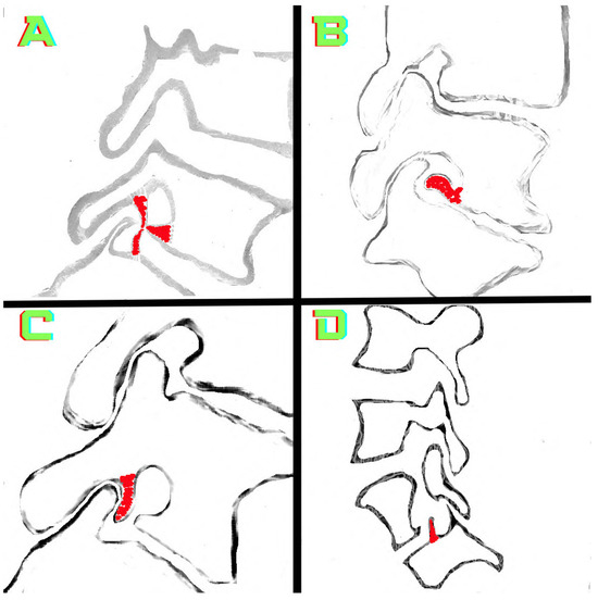 Intervertebral foramina and osteophytes are illustrated. (A) Osteophytes (red area) arising from three different points. (B) An osteophyte (red area) arising from the inferior endplate of the superior vertebrae. (C) An osteophyte (red area) arising from the pedicle–lamina junction. (D) A big osteophyte (red area) arising from the lower vertebral endplate of the intervertebral foramen is observed. Simultaneously, osteophytization is observed at two distinct points.