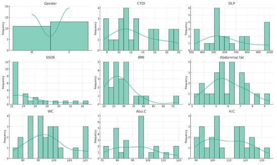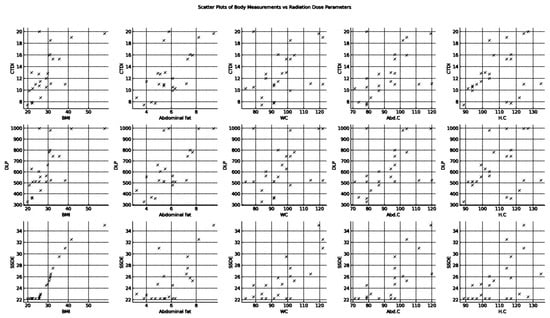 Body metrics such as waist circumference (WC), hip circumference (HC), body mass index (BMI), and abdominal fat have been identified as potential factors that could influence the radiation dose in CT scans. These metrics provide a more individualized assessment of a patient’s body composition than traditional methods, which rely on standardized phantoms. Abdominal, waist, and hip circumference are essential because they directly affect how radiation is absorbed and scattered within the body. BMI, which considers both weight and height, is another crucial factor that could influence radiation dose requirements. The rationale is that these metrics, when considered, could lead to more precise and optimized dosing, potentially reducing the risk of overexposure in larger patients or underexposure in more minor patients [,,].