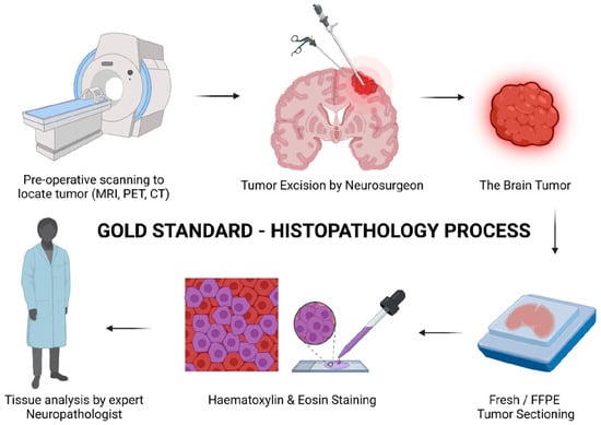 Schematic representation of the long and tedious histopathology process. The patients need to undergo initial scanning to identify the tumor. This is followed by a sample section which further undergoes multiple processing steps, taking a longer time, and needs to be confirmed by a neuropathologist which increases the chances of error. An error or partial removal of a tumor leads to invasive surgery, again affecting the health and quality of life of the patient (created with Biorender.com). Copyright © 2023 The Authors. CS Omega published by American Chemical Society [13].