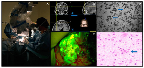 Confocal Laser Microscopy in vivo Convivo case (Besta Neurological Institute, Milan, Italy). (A). The confocal probe is dressed with its appropriate sterile sheath and used directly on the cerebral surface. (B). Preoperative magnetic resonance with contrast administration images loaded on the neuronavigation system (Stealth S8-Medtronic) of a right frontal parasagittal anaplastic oligodendroglioma, IDH mutant (WHO grade III). (C). Intraoperative view of fluorescein-guided removal of the tumor under YELLOW560 filter activation on a Pentero microscope (Carl Zeiss Meditec). (D). Convivo in vivo image taken at the center of the tumor showing tumor cells along with typical perineural satellitosis (small arrows), which can be easily found on a relative histopathological image as well (hematoxylin and eosin, big arrow, (E)). Copyright© 2021 The Authors. Journal of Clinical Medicine published by MDPI, Basel, Switzerland [60].