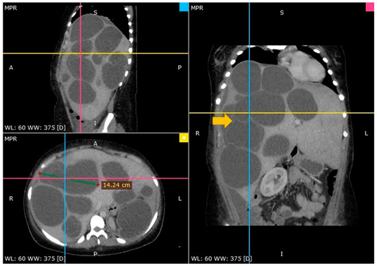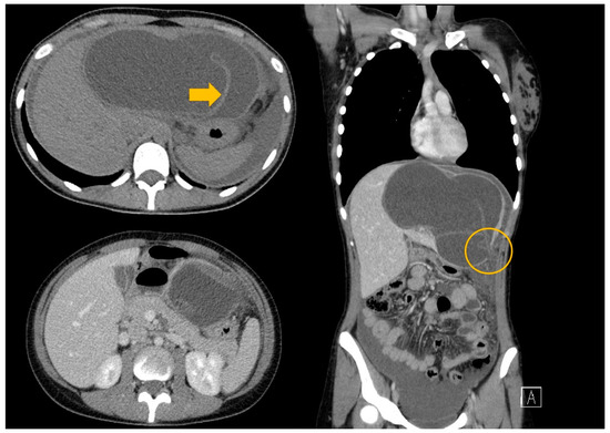 The clinical examination revealed an abdominal mass extending from the epigastric area to the right hypochondrium, in addition to diffuse abdominal discomfort. Plasma fibrinogen levels of 664 mg/dL (normal range: 200–400 mg/dL) were indicative of non-specific inflammatory illness. Otherwise, leucocytes, granulocytes, liver enzymes, bilirubin, and lipase were all within normal ranges.
