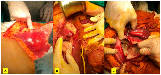 (A) The initial intraoperative aspect; (B) mobilized liver, a pericystectomy of the most anterior cysts and Huang’s loop prepared for Pringle maneuver; (C) the inner aspect of the largest cyst (no bile leaks).