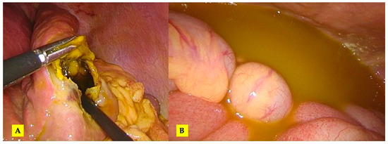 The intraoperative aspect: (A) evident rupture of the hydatid cyst at the level of segment III and (B) free peritoneal fluid in the peritoneal cavity.