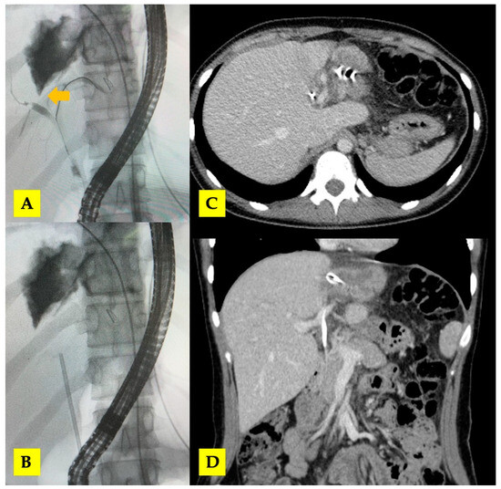 (A,B) ERCP with biliary stent placement (arrow—central biliary communication with right hepatic duct); (C,D) post-ERCP CT scan with biliary stent in situ.