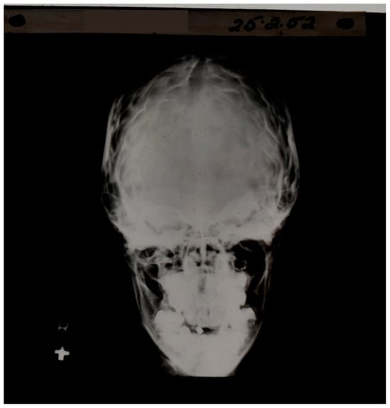 Early skull X-ray. Contrast is seen between bone and air as well as between bone of different thicknesses; however, the soft tissue of the brain is not directly observable.