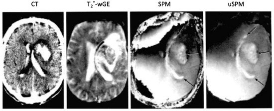 Intracranial hematomas: CT, heavily T2*-weighted gradient echo (T2*-wGE), susceptibility phase map (SPM) and partly unwrapped SPM (uSPM) 0.15 T (1987) images [12]. The CT image shows the intraparenchymal and ventricular hematomas with high signal. These images show some low signal on the T2*-wGE image. There are specific changes due to susceptibility contrast seen on the SPM and uSPM phase maps (arrows).