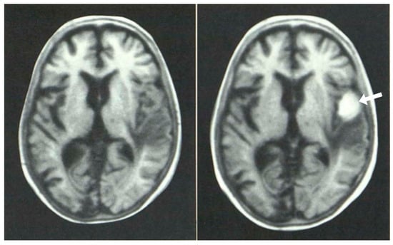 Glioma: pre (left) and post (right) intravenous GBCA shown with inversion recovery (IR) images (March 1984) [14]. The glioma and edema have a low signal on pre-enhancement (left) images but the signal in the tumor is increased by the GBCA and is seen with high positive contrast (white arrow).