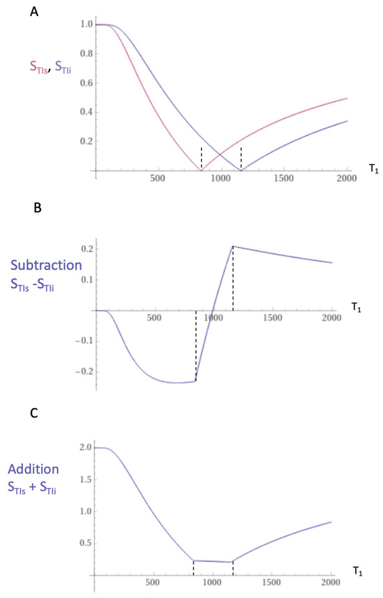 Subtracted IR (SIR) and Added IR (AIR) T1-filters. T1 is shown along the linear X axes in ms. (A) shows the TIs T1-filter (pink) and TIi T1-filter (blue), (B) shows the subtraction (STIs − STIi) IR or SIR T1-filter, and (C) shows the addition (STIs + STIi) IR or AIR T1-filter. The middle Domain (mD) is the T1 values along the X axis between the vertical dashed lines. In (B), the slope of the SIR T1-filter in the mD is approximately double that of the STIs T1-filter (pink in (A)). In (C), the signal at T1 = 0 is doubled to 2.0, and the signal in the mD is reduced to approximately 0.20 in the nearly linear, slightly downward sloping central part of the AIR T1-filter (i.e., in the middle Domain, mD).