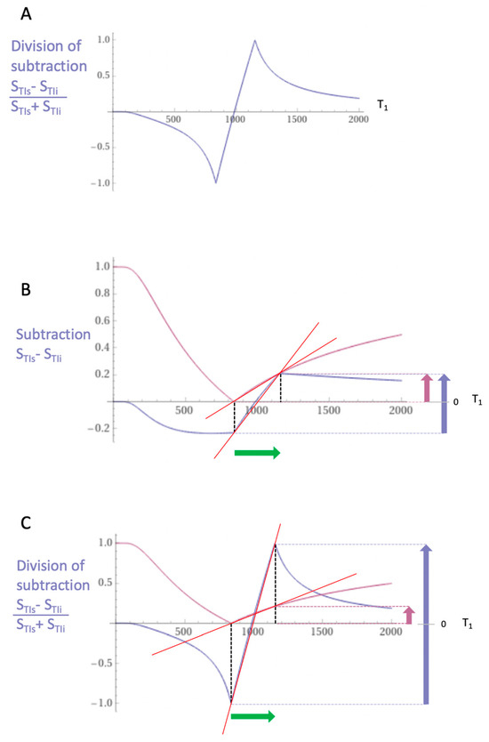 Divided subtracted IR (A), subtracted IR showing contrast (B) and divided subtracted IR showing contrast (C) images. (A) shows division of the SIR T1-filter (B) by the addition T1-filter (C) to give the dSIR T1-bipolar filter. (B) shows comparison of the conventional IR STIs T1-filter (pink) and the SIR T1-filter (blue) for a small increase in T1 (horizontal green arrow, ΔT1). (C) is a comparison of the STIs T1-filter (pink) with dSIR T1-filter (blue) for the small increase in T1. In (B), the contrast produced by the SIR T1-filter is twice that produced by the IR T1-filter (blue and pink arrows). In (C), the contrast produced by the dSIR T1-bipolar filter is ten times greater than that produced by the IR T1-filter (blue and pink arrows).