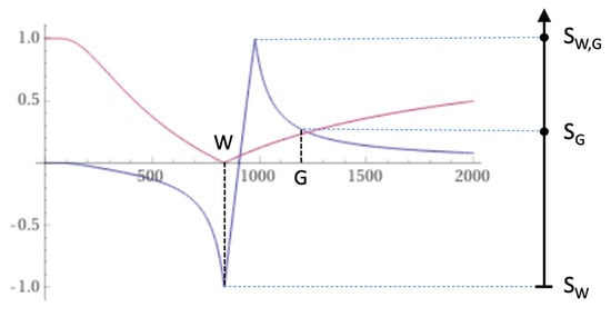 Boundaries. This image shows a narrow mD dSIR T1-bipolar filter with a mD extending from white matter (W) to a T1W,G between the TIs of W and gray matter (G) (blue), and a white matter nulled conventional IR T1-filter, e.g., MP-RAGE (pink). The X axis is linear and is shown in ms. The peak signal (SW,G) appears between W and G along the X axis, where there is a partial volume effect between W and G producing a T1W,G between the T1s of W and G. This results in the high signal, SW,G between W and G. This corresponds to the high signal boundary between W and G shown in the following Figure 16 (left column).