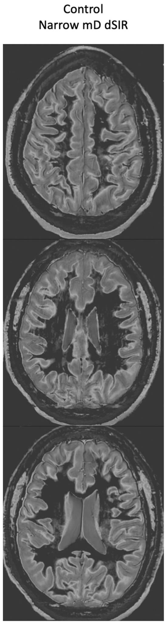 Figure 16 shows narrow mD dSIR images from the normal 18-year-old control. His white matter is normal and shows a low signal (dark) appearance with a mid-gray appearance in and around the corticospinal tracts (whiteout sign grade 1, Table 2). Normal high signal boundaries (white lines) are seen at junctions between white and gray matter.