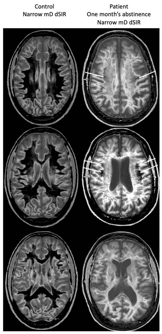 Figure 17, left column shows narrow mD dSIR images from the 50-year-old normal control (left column) and from the patient at his initial MR examination after one month’s abstinence. The normal control shows a very low signal (dark) appearance in most of his white matter. There is an intermediate signal and higher signal in and around the corticospinal tracts (whiteout sign grade 1). In the right column, the patient’s white matter shows extensive areas of high signal with only small areas of more normal lower signal white matter present in the periphery (white arrows) (whiteout sign grade 4).