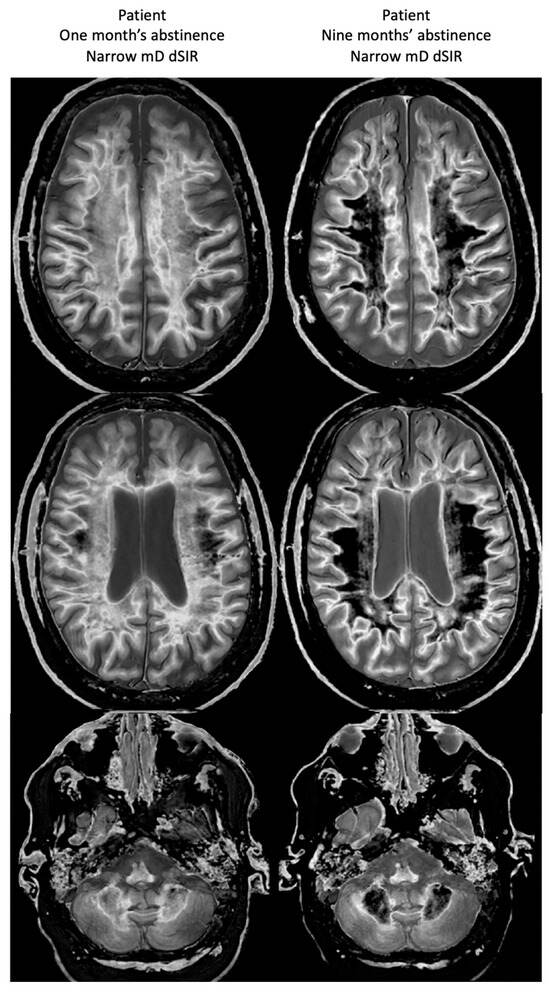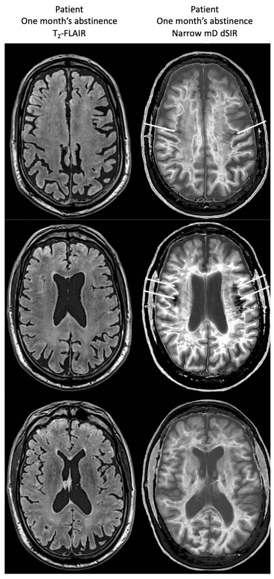 Figure 19 shows narrow mD dSIR images in the patient after one month’s abstinence (left column) and after nine months’ abstinence (right column). Extensive abnormal high signal is seen in white matter after one month’s abstinence (left column). There is marked reduction in the extent of these high signal abnormalities in white matter after nine months abstinence from whiteout sign grade 4 to grade 2 (right column). The patient clinically improved during this period.