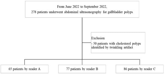 From June 2022 to September 2022, there were 278 patients who underwent abdominal US examination for GB polyps in our hospital. Among them, fifty patients with cholesterol GB polyps that were difficult to differentiate from other GB pathologies such as combined GB stones/sludge, as identified by the twinkling artifact, were excluded. Finally, a total of 228 patients who underwent abdominal US performed by one of three radiologists (a third-year radiology resident [reader A], a radiologist with 7 years of experience in abdominal US [reader B], and an abdominal radiologist with 8 years of experience in abdominal US [reader C]) were included in this study (Figure 1).