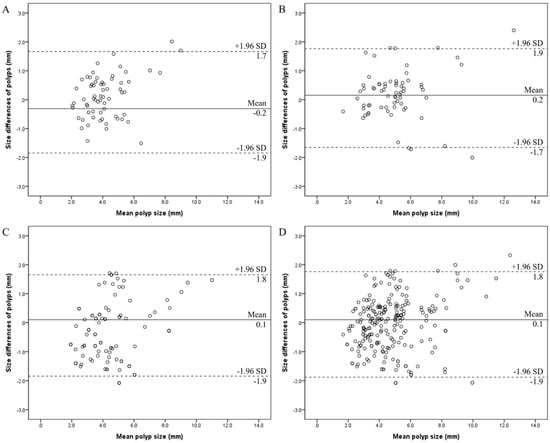 Figure 3 depicts Bland–Altman plots of polyp size measurements in each reader. The 95% limit of agreement of each reader was 1.9 mm of the mean in all readers. Moreover, the 95% limit of agreement of all 228 GB polyps was also 1.9 mm.
