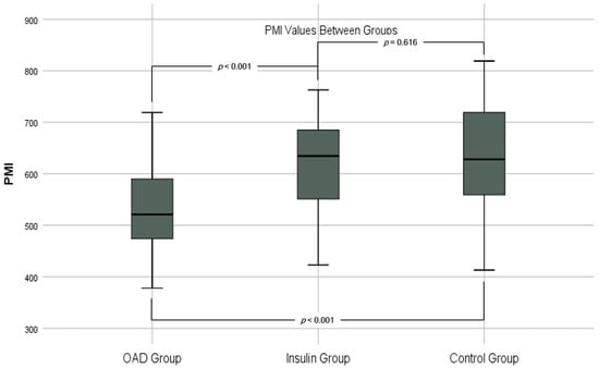 In group comparisons, PMI values were significantly higher in the insulin group compared to the OAD group (p < 0.001). The OAD group exhibited significantly lower PMI values than the control group (p < 0.001), while no significant difference was observed between the insulin group and the control group (p = 0.616) (Table 2) (Figure 2).
