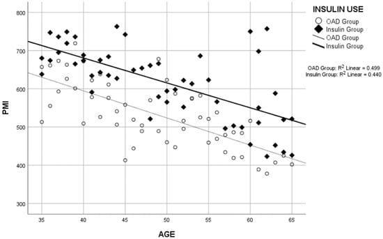 A longer T2DM duration increases sarcopenia risk among patients [,]. We observed a significant negative correlation between T2DM duration and PMI, with insulin-using patients having a much longer diabetes duration than those using oral antidiabetic medications. Despite this, PMI values were significantly higher in the insulin group than the oral antidiabetic group (Table 2 and Table 3 and Figure 2 and Figure 3), indicating that insulin therapy reduces sarcopenia risk regardless of diabetes duration.