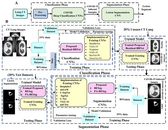 The research presents a new CNN-based diagnosis approach for automated COVID-19 abnormality analysis in lung CT. The framework is structured into two stages: classification and segmentation. Initially, the classification model discriminates between individuals with COVID-19 infection and healthy CT samples. PA-RESeg, a Region Estimation-based segmentation CNN, has subsequently been introduced for analyzing infectious lung regions. This framework introduces three key technical novelties: (1) the Residual-BRNet classification technique, (2) the PA-RESeg segmentation technique, and (3) the implementation of customized classification and analysis CNNs. Moreover, the framework conducts the segmentation of the COVID-19 lesion regions in CT to capture detailed region information, assisting in assessing infection spread. Figure 1 shows the developed framework, encompassing both summary and detailed processes.
