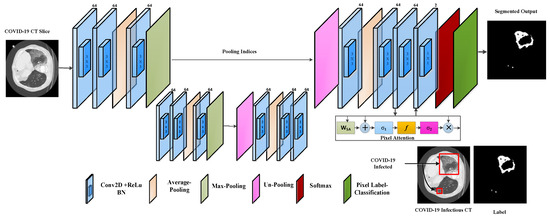 In Equations (8) and (9), and represent the average and maximum pooling operations with ‘s’ stride, respectively, and are applied to the convolved output . We utilized an encoder–decoder technique for precise segmentation, capitalizing on the encoding stages’ capacity to learn semantically significant object-specific details. However, the encoding process can result in the loss of spatial information critical for object segmentation. To resolve this, in the decoding stage, the encoder’s channels are reconstructed using max-pooling indices to locate infectious regions. The final layer employs a 2 × 2 Conv operation to classify each pixel as a COVID-19 infectious region or background (healthy) using cross-entropy activation. The encoder–decoder design exhibits symmetry, with the encoder’s max-pooling layer replaced by the decoder’s unpooling layers.