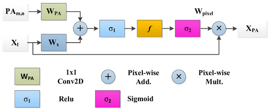 Equation (10) defines as the input map and as the pixel-weightage within the range of [0, 1]. The outcome delineates the infectious area and attenuates redundant information. Equations (11) and (12) utilize and as the ReLU and Sigmoid activation, respectively. and represent biases, and , , and is the linear transformation.