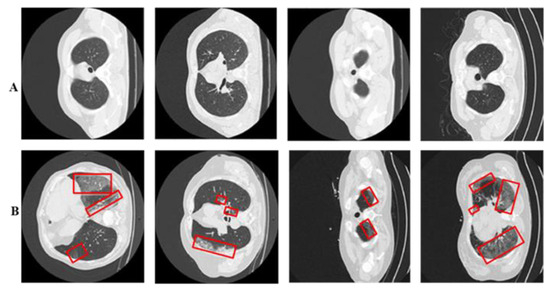 Panel (A) displays healthy lung CT samples, while panel (B) showcases COVID-19-infected lung CT samples. Red boxes highlight regions of infection.