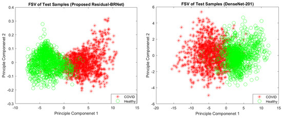 The proposed Residual-BRNet’s performance is assessed on the test set, measuring accuracy, F-score, MCC, sensitivity, specificity, and precision (Table 2). Compared to baseline DenseNet, Residual-BRNet exhibits superior generalization, with a higher F-score (Residual-BRNet: 98.01%, DenseNet: 96.77%), accuracy (Residual-BRNet: 97.97%, DenseNet: 96.73%), and MCC (Residual-BRNet: 96.81%, DenseNet: 92.02%). The discriminative ability of Residual-BRNet is further demonstrated in the PCA plot. Additionally, a comparative feature-based analysis of the best-performing DenseNet models is presented in Figure 6 for reference.