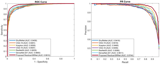 PR and ROC curves are utilized for the quantitative evaluation of the segregation ability of detection CNNs, as depicted in Figure 8. These curves act as performance metrics, assessing the classifier’s generalization ability by showcasing the distinction of inter-class variation across varying thresholds. PR curves for Residual-BRNet and existing CNN, demonstrating the superior learning capacity of the proposed CNN. The proposed Residual-BRNet outperforms DenseNet and other deep CNN models in terms of AUCs, F-score, accuracy, and overall MCC (Table 2).