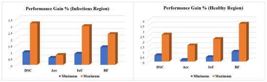 The diagnosis framework’s performance is evaluated using detection and segmentation metrics. Detection metrics, including accuracy (Acc), sensitivity (S), precision (P), specificity (Sp), MCC, and F-score, are accompanied by Equations (13)–(17). Segmentation models are assessed based on segmentation accuracy (S-Acc), IoU, and DS coefficient, as presented in Equations (18) and (19). Accuracy represents the accurate segregation of infected and healthy class samples, while S-Acc indicates the accurate prediction of infected and healthy pixels. The DSC metric evaluates structure similarity, and IoU quantifies the overlapping ratio between detected and labelled pixels. A further explanation of performance metrics is shown in Table 1.