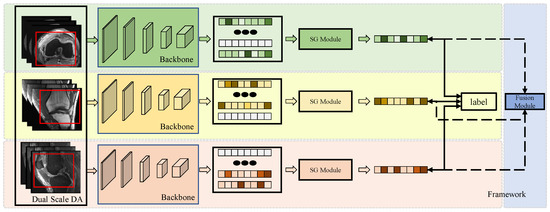 The framework of the model is illustrated in Figure 1. The proposed model consists of three main modules: (1) the Dual-Scale Data Augmentation module, (2) the selective group attention module, and (3) the fusion module. The scan image of each individual perspective is processed with dual-scale data augmentation and fed into the basic backbone to generate the original feature map. Then, the selective group attention module is used to capture relationships across the layer, channel, and space scales. Finally, the fusion module assembles the predictions made with different input views to obtain the final classification result. Details of the proposed model are discussed in the following subsections.