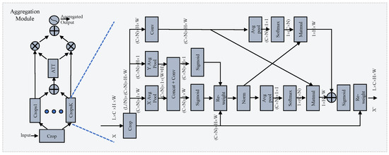 where the aggregation operation denotes the group module, which adopts a different layer size for each group, and “input” denotes the features generated by the backbone. denotes the enhanced feature maps with different aggregations. The enhanced feature maps are fed into the ATT block, as shown in Figure 3, to calculate the attention. First, the outcomes of the individual crop groups are fused via element-wise summation: