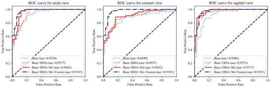To comprehensively evaluate the proposed modules, an extensive array of experiments was conducted, encompassing all three views. As depicted in Figure 4 and Table 3, the proposed modules resulted in significant improvements in model performance when fed with each individual view and further enhanced performance through the fusion of three views. Taking the AUC as the evaluation metric, which balances the classification accuracy across positive and negative cases while mitigating the impact of class imbalance, the augmentation techniques yielded improvements of 1.4%, 2.4%, and 3.7% for the axial, coronal, and sagittal views, respectively. Furthermore, the integration of the SG module into the architecture demonstrated notable enhancements in performance, with 2.3%, 0.8%, and 1.5% improvements on the three views, respectively. Finally, the fusion module assembles the outcomes of three individual views into the final prediction, achieving the best differentiation performance with an AUC of 0.9747. As shown in Table 3, for all three views, the model with the proposed AUG and SG modules achieved the best accuracy. The fusion module further improved the performance. Even compared with the best results of the individual view, the fusion module enabled the proposed model to achieve an improvement of 2.5% in accuracy and 1.7% in sensitivity, with only a 0.17% decrease in specificity compared to a highly unbalanced result in the axial view. The results of these experiments validate the effectiveness of the proposed modules.