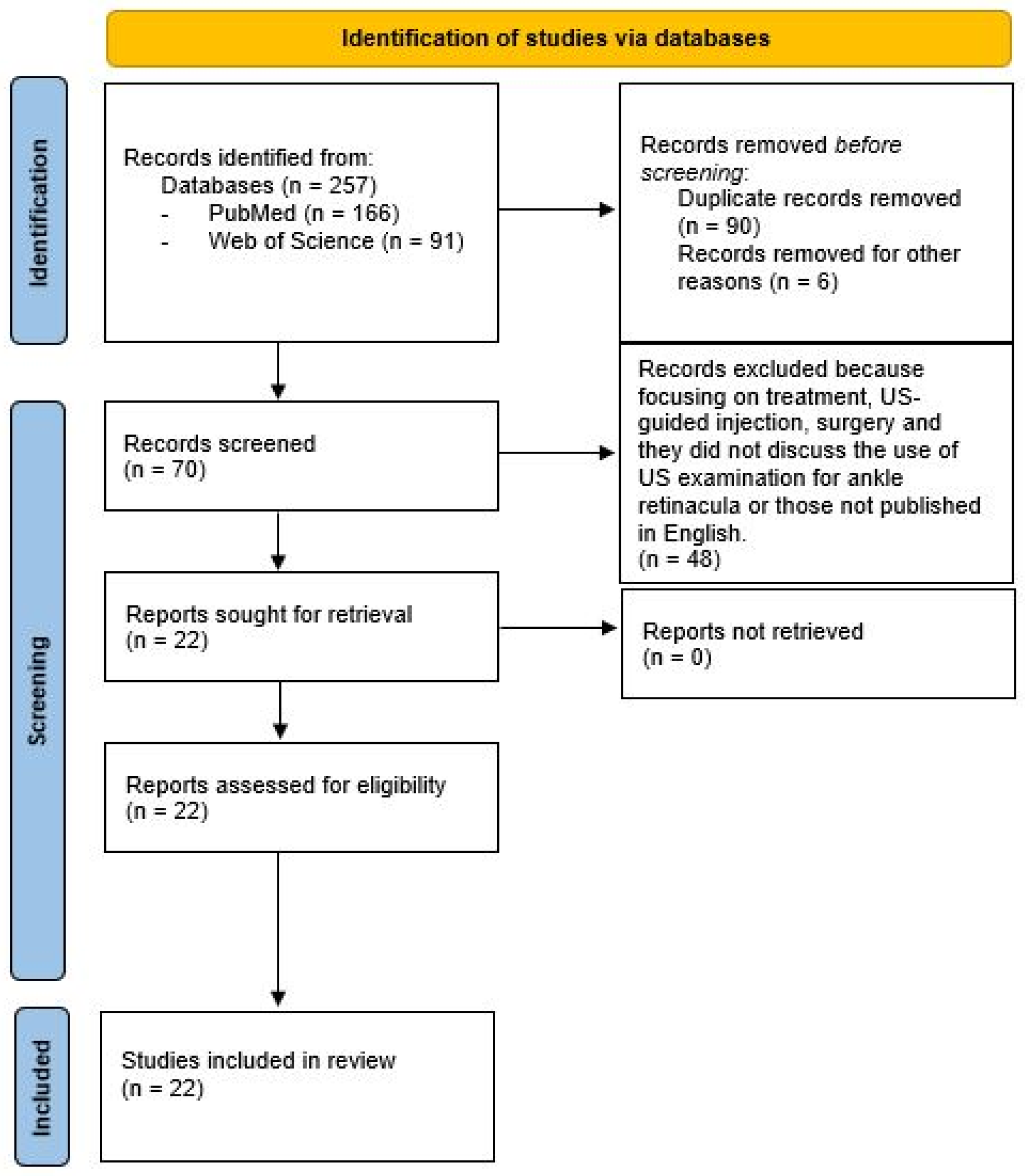 | Draghi F (2018) [21] | Review | - | - | - | - | Superior and inferior peroneal retinacula | High-frequency linear array transducer | B-mode | Supine on the examination table, the knee joint flexed and the ankle internally rotated | Long axes by placing the transducer in an oblique plane according to their course | Integrity | - | - | To provide an overview of the anatomic basis for peroneal intrasheath instability and provide physicians with guidelines for its ultrasound assessment. |