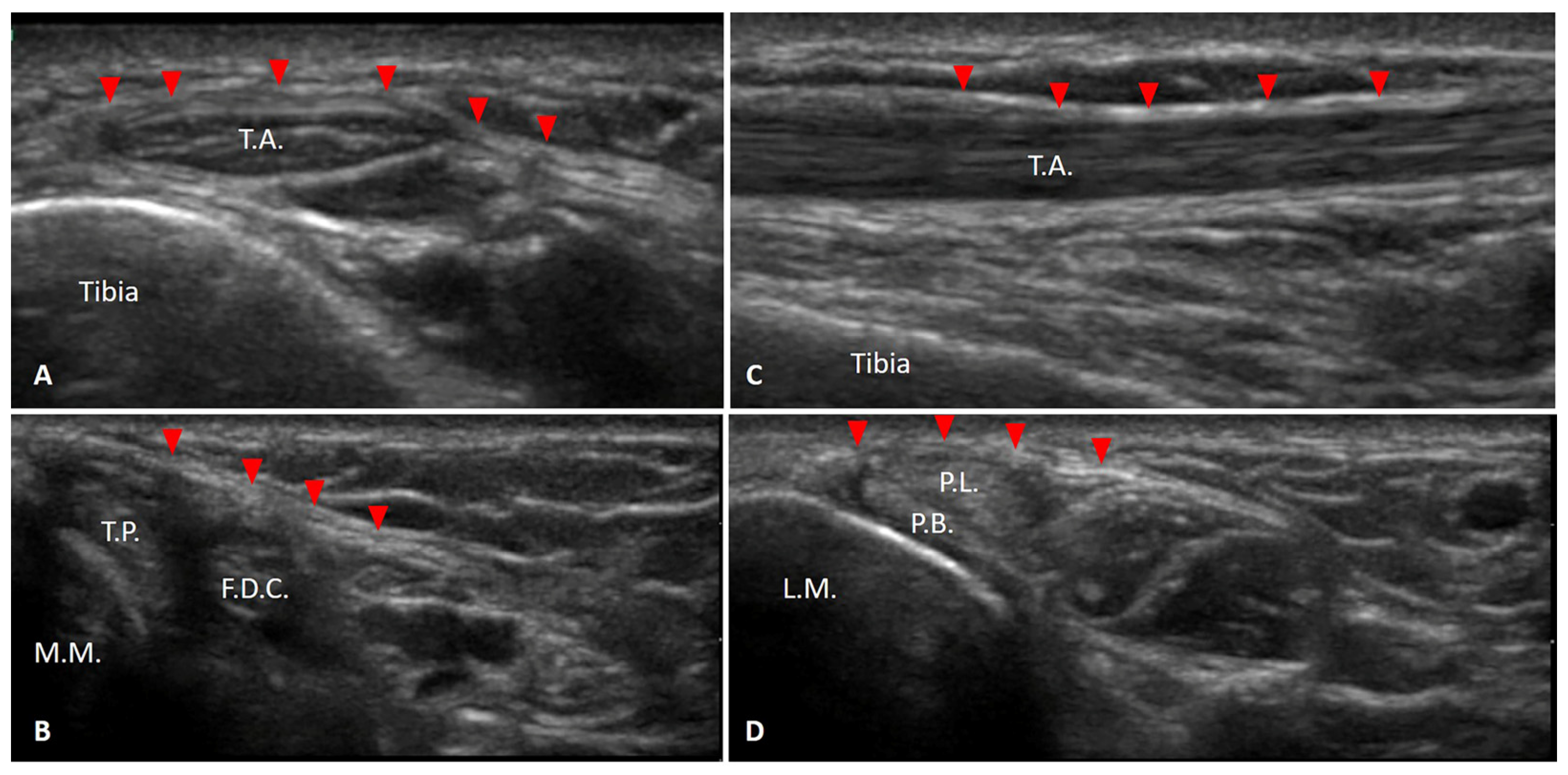 | Pirri C. (2023) [12] | Case report | 1 | right ankle pain | M | Superior extensor retinaculum and inferior extensor retinaculum | B-mode and sonopalpation | - | - | Thickness | 2.05 mm | - | - | ||