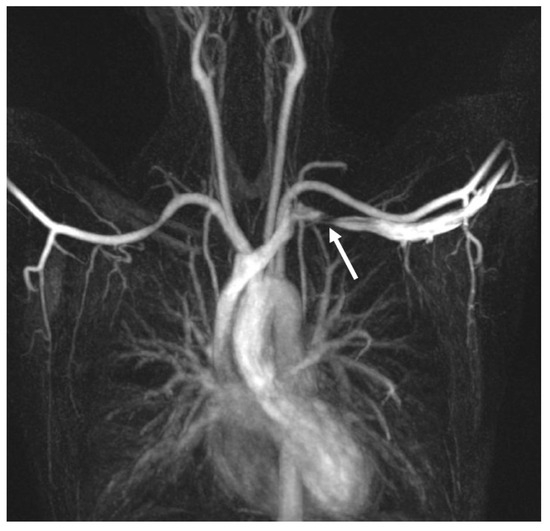 MRI disclosing left subclavian vein stenosis (white arrow) after ipsilateral arm abduction.