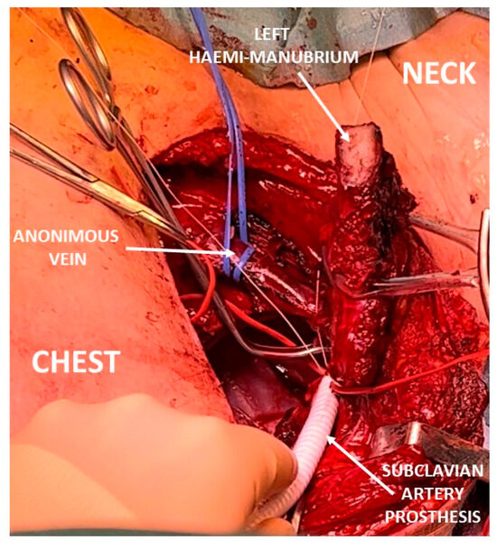 Intraoperative view of subclavian artery prosthetic reconstruction.