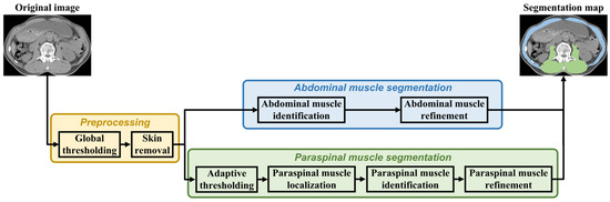 The proposed skeletal muscle segmentation algorithm was adapted from the algorithm presented in [51]. Figure 2 shows the overall workflow of the proposed algorithm. The workflow consists of three main components: preprocessing, abdominal muscle segmentation, and paraspinal muscle segmentation [52]. Note that the abdominal muscle segmentation and paraspinal muscle segmentation were performed concurrently, which could lead to improved efficiency compared to that when performing them sequentially.
