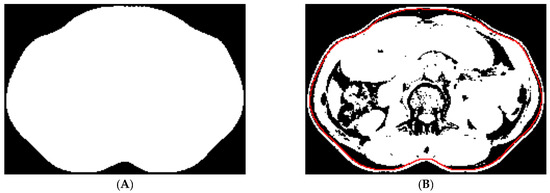 (a) Abdominal muscle identification: The aim here is to identify the thin layer of abdominal muscles. The convex hull of the contour of the segmented region in the previous step was found (Figure 4A). Then, a Chebyshev distance map was generated from the convex hull. Inside the segmented region, the most probable distance was determined by locating the isocontour that intersected the highest number of zero-valued pixels (Figure 4B). The pixels inside and on the isocontour were removed.