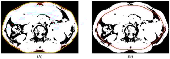(A) The body region on the original image. (B) We used the most probable distance (red contour) to remove the skin tissue pixels.