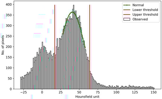 (a) Adaptive thresholding: This step aims to determine the paraspinal muscle candidates. For the skin-removed body pixels in the preprocessed results, a normal distribution was fitted to the peak of the pixel value histogram to obtain the mean value μ and the standard deviation σ. Adaptive thresholds were then empirically set to be μ – 1.5σ and μ + 1.5σ (confidence coefficient = 86.6%) (Figure 6), which were used as the lower and upper segmentation thresholds. The pixels with values in between were segmented.
